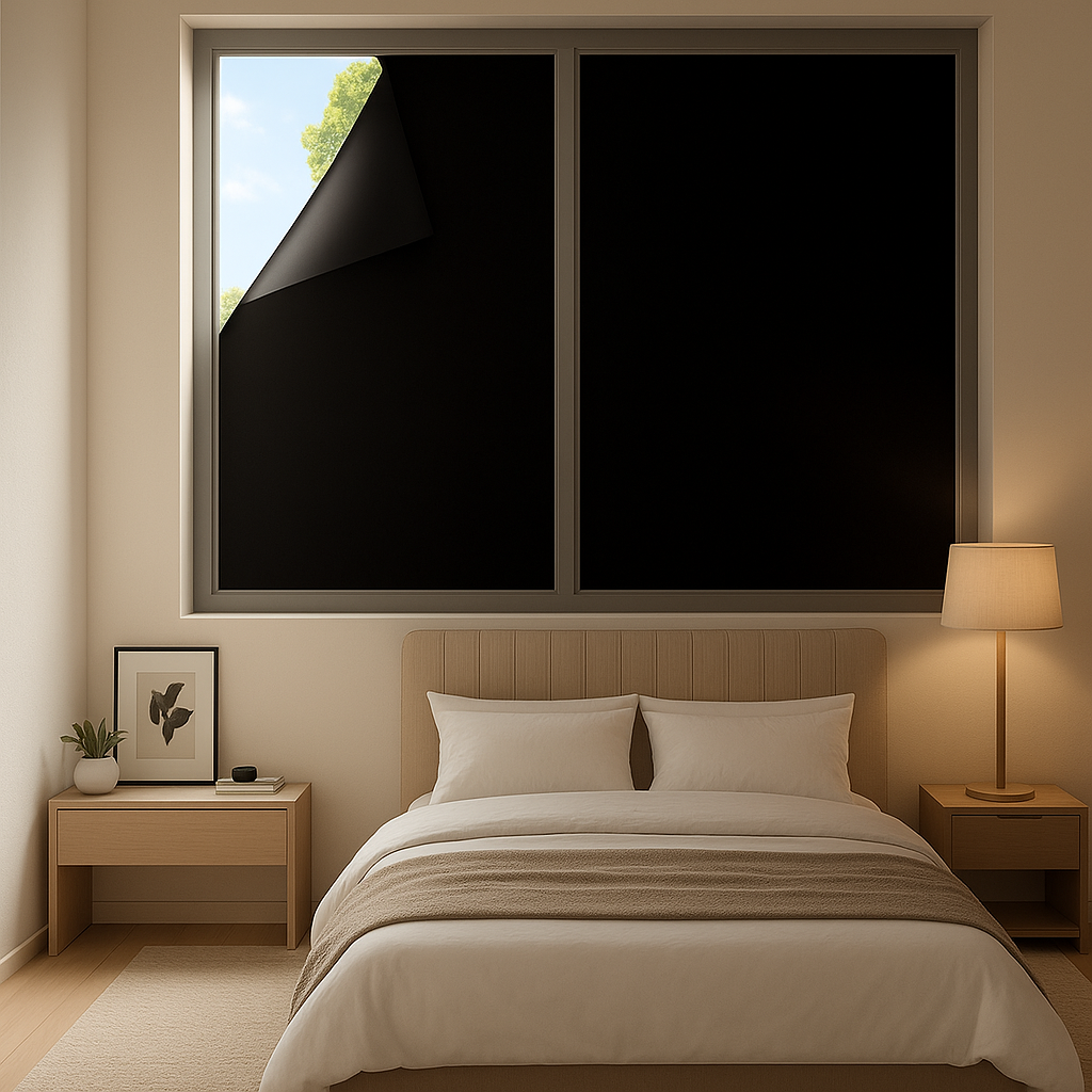 We create easy, stick-on block-out blinds that instantly darken and cool your space, making every room a place to rest, recharge, and truly switch off.